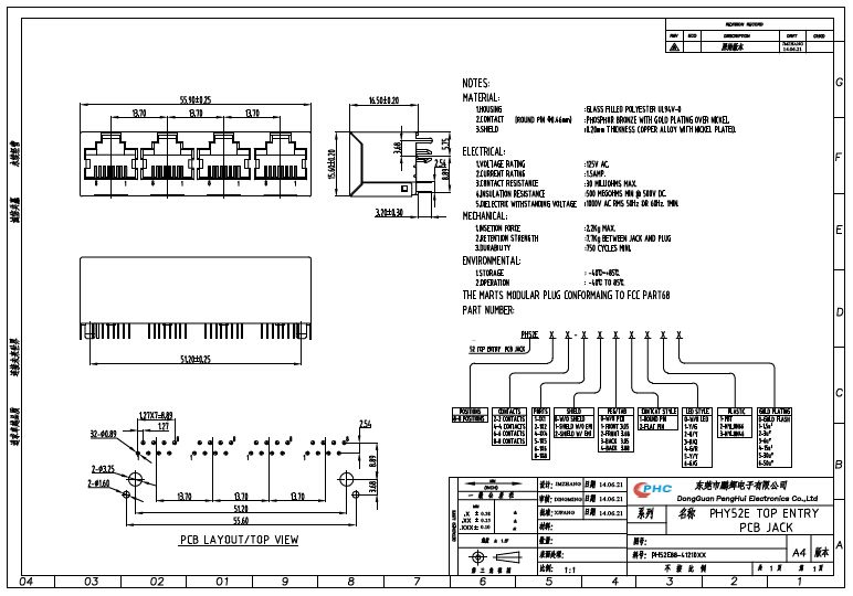 PH1052-208036 带屏蔽RJ45 180度直插 1X4多口网络接口无灯无弹